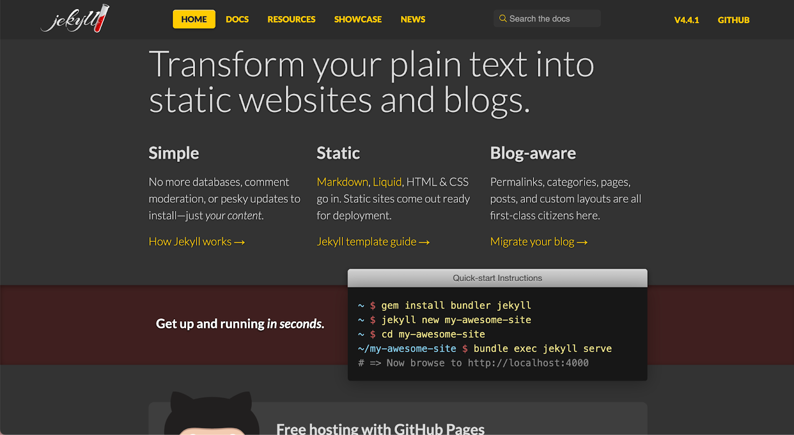 Jekyll is a static site generator. Instead of a database, it takes your content, runs it through templates, and generates a website made of simple HTML, CSS, and JavaScript files. This results in incredibly fast and secure websites, but it requires some comfort with the command line and markup languages.