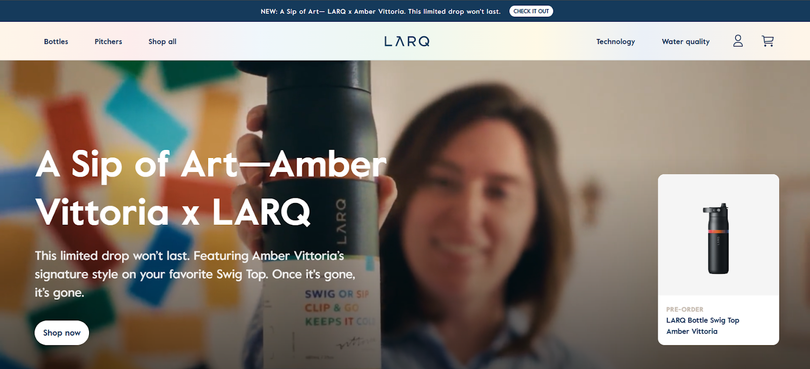 LARQ sells self-purifying water bottles and pitchers, and their website effectively communicates the advanced technology behind their products. The design is clean, minimalist, and feels high-tech.