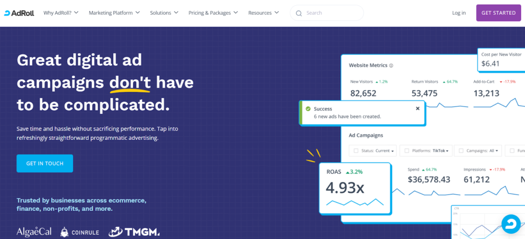 AdRoll is a digital advertising platform focused on helping businesses increase brand awareness and drive website visitors through personalized advertisements. The platform is trusted by over 140,000 companies to help drive performance and scale their marketing operations. It provides a range of features designed to improve customer engagement at different stages of the marketing funnel, including retargeting campaigns, automated audience segmentation, and detailed analytics.