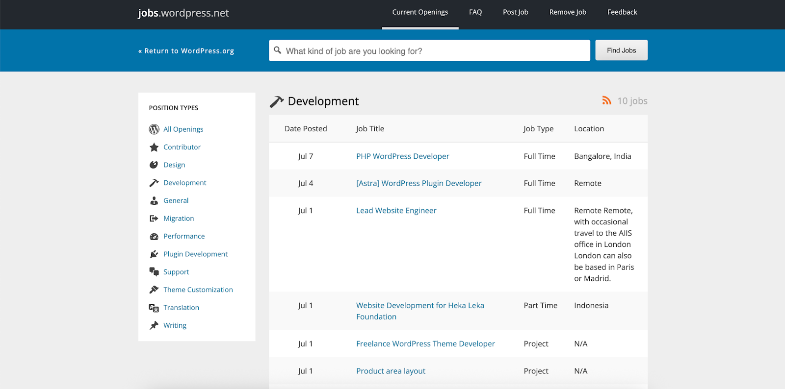 WordPress Jobs is the official job board of WordPress.org. It’s a straightforward platform for posting and finding WordPress-related job opportunities, including full-time positions, freelance projects, and contract work.