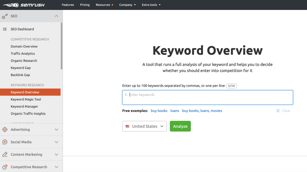 The SEMrush visibility management platform also provides keyword research solutions. You can perform a quick analysis using Keyword Overview, while Keyword Magic is perfect for identifying long-tail keywords: