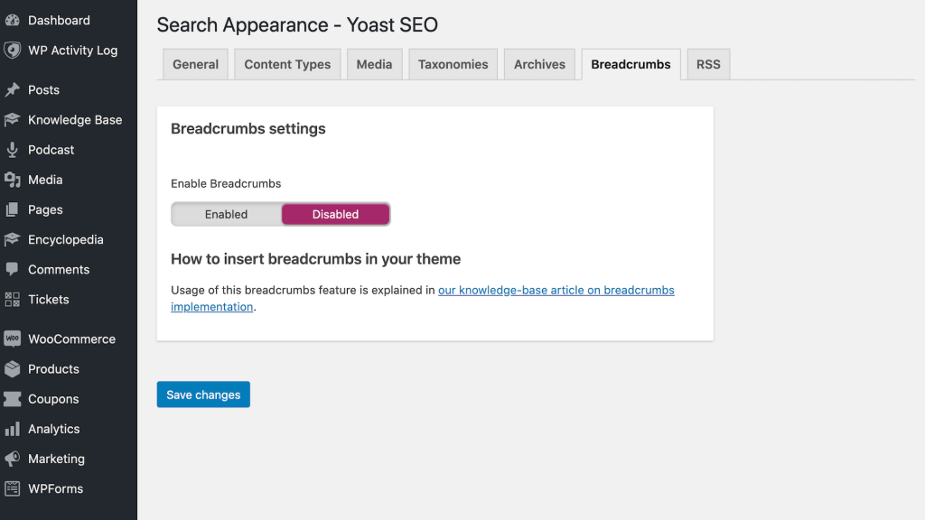 For example, Yoast SEO can customize the contents of each product’s auto-generated breadcrumbs. To do this, navigate to Yoast SEO > Search Appearance > Breadcrumbs:
