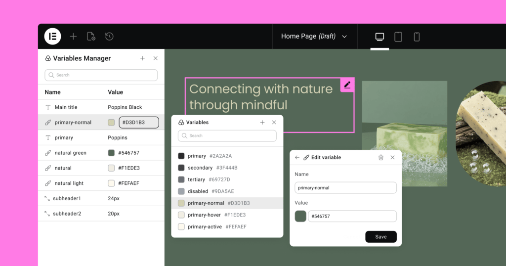 • Centralized management: View and edit all Variables (colors, typography, sizes) in a single structured panel.