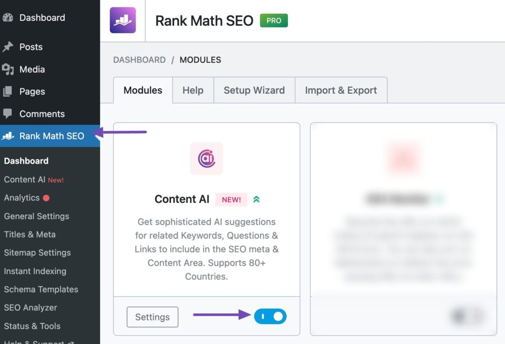 In your WordPress dashboard, go to Rank Math SEO → Dashboard → Modules. Enable the Content AI module.