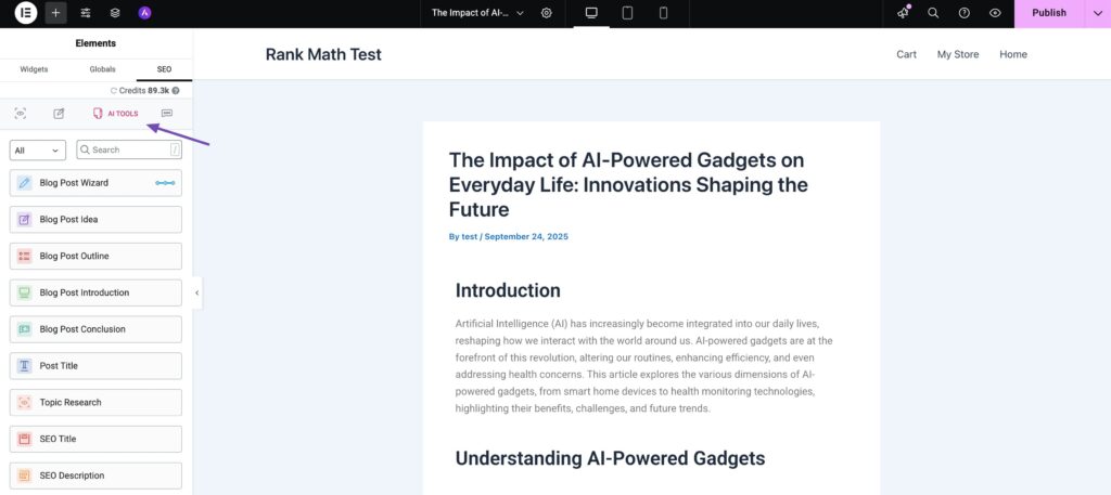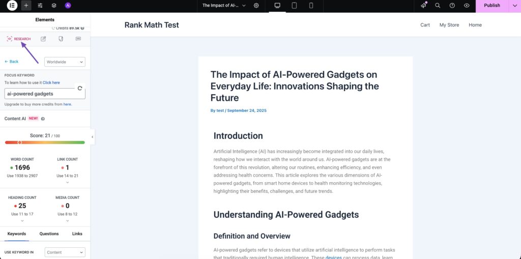 Content AI is an intelligent writing assistant built into Rank Math. It helps you research keywords, generate content ideas, and even write optimized copy directly within Elementor.