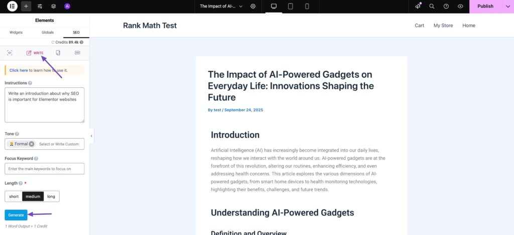 When you’re stuck writing a headline or intro, open the Write view. Give the AI a short prompt like “Write an introduction about why SEO is important for Elementor websites,” and click on Generate, as shown below.