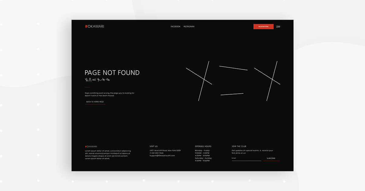 Our main priority when a user ends up on our 404 page is to redirect him back to the website as soon as possible and to eliminate any possible distractions or confusing navigation. Therefore, using a minimalist, brief message and visual scheme is the best way to facilitate that.