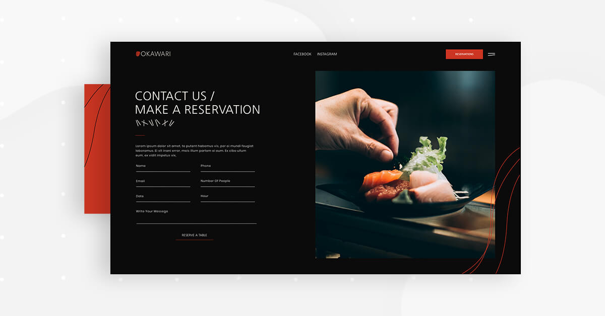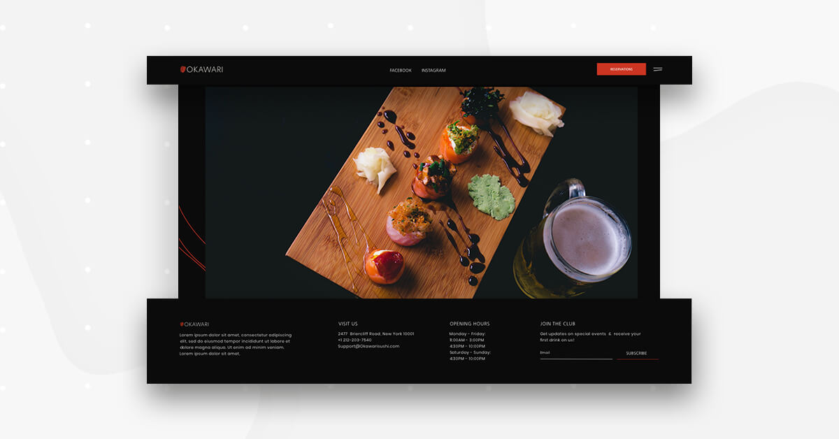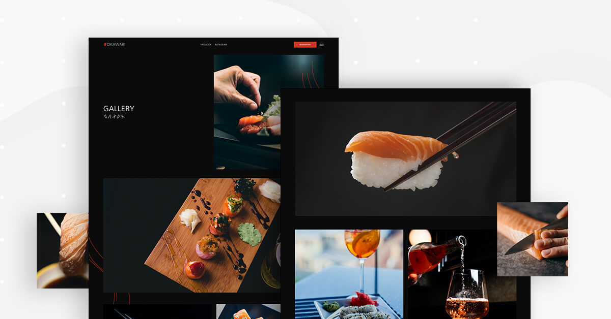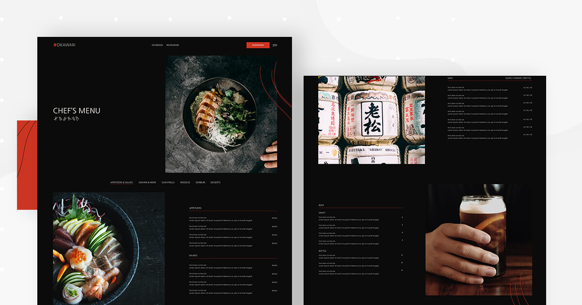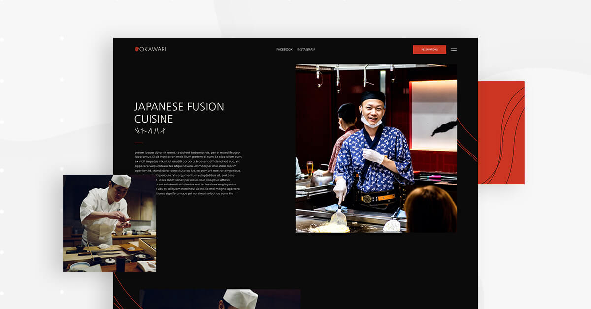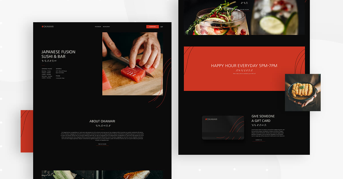 What’s unique about the design scheme used here is that the template’s entire color palette is based on the details of the homepage’s hero image: a deep red-orange slice of raw salmon. This exact shade of red is used for the ‘Reservations’ button and in the Okawari’s logo in the top left corner.