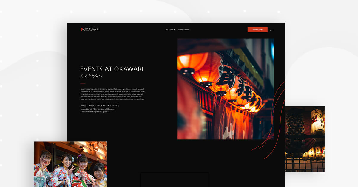 Showing the lanterns and thematic decor of the restaurant also conveys the message that attending an event or party at Okawari is a truly traditional Japanese celebration experience, with a friendly lighting scheme that gets users excited about walking through the door.