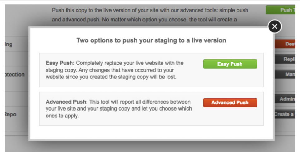 Host sites that offer staging services have similar features that allow us to push the new version of our site from Staging to our Live sites, with minimum effort and zero worry.