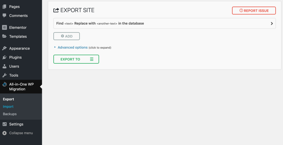 On the WordPress dashboard’s left menu bar, under the All-in-One WP Migration’ tab click on the tab and select ‘Export’.