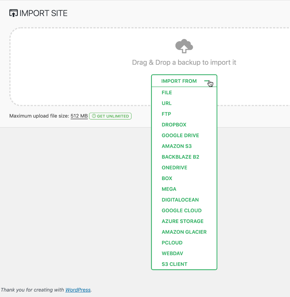 With the backup of our Staging site downloaded, we’ll go to our Live site’s WordPress dashboard. In the left menu bar, we’ll click on ‘All-in-One WP Migration’, but this time we’ll select ‘Import’, and in the Import window, we’ll click on Import, and from the dropdown menu, we’ll select File.