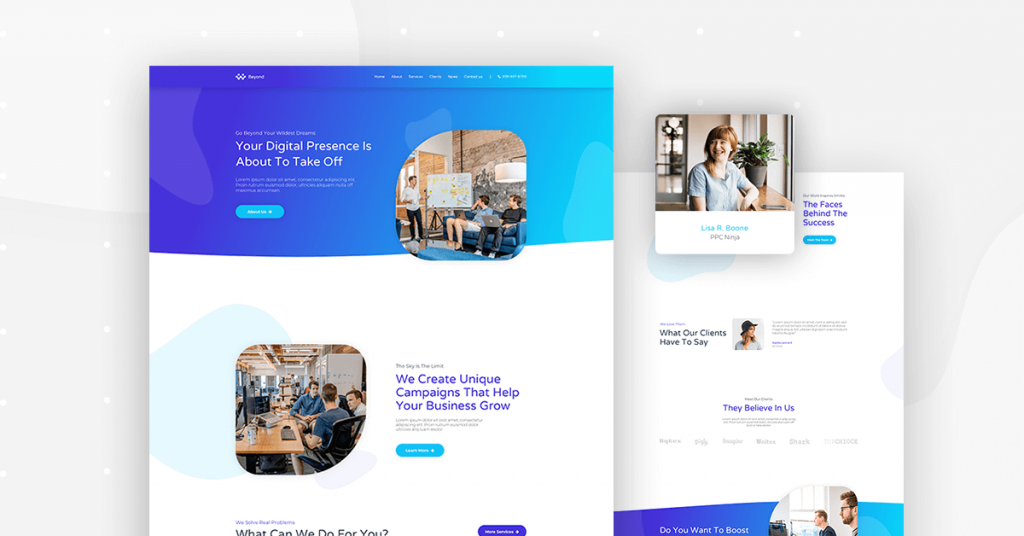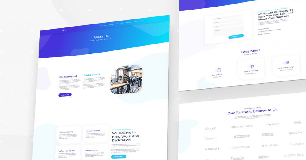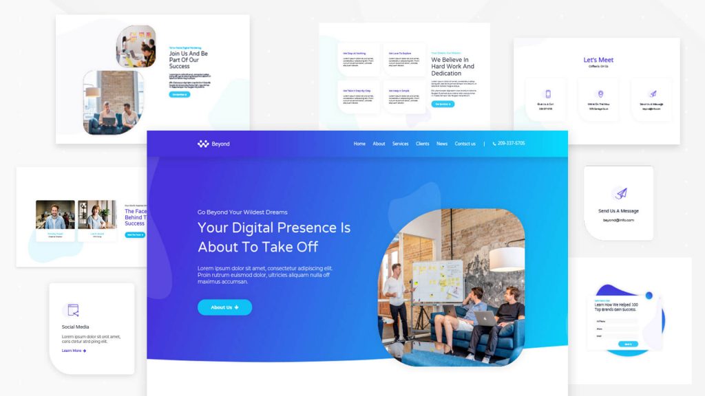The header can be used with Elementor’s Theme Builder, and published throughout the site. It’s simple and straightforward and includes the original logo we created for the ‘Beyond’ agency, a menu, and a telephone number.