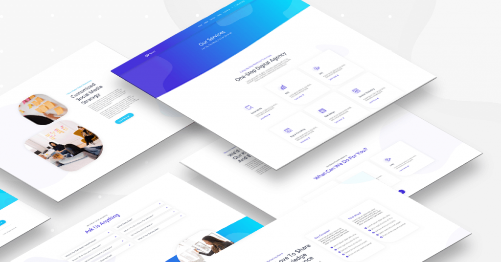Since digital services like SEO and PPC are mostly not visual and do not always relate to each other, fluid shapes were used to tie all the services together and give the whole design an overall aesthetic look and feel. This is also aided by the use of smooth gradients and the techy blue color.