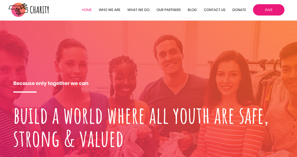 This theme reminds us that childhood should be a bright time. As soon as you land on this page, vibrant gradients immediately capture your attention, create a positive mood, and inspire us to scroll for more information. But not only the visual side is excellent; the way information is delivered to visitors is also great. As you start scrolling, you see sections “Who we are,” “What we do,” “Partners.” At the time when you reach the end of the page, you will see a CTA button for donations.