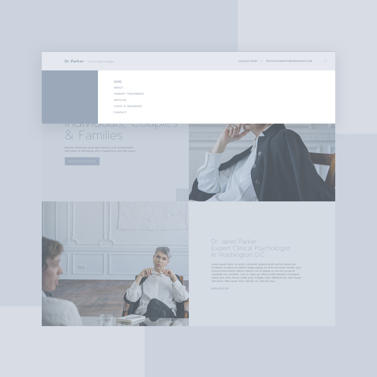 One of the strongest characteristics of the homepage design is the choice of large, crisp photographs that tell the “story” of the personality and professional approach of the psychologist. The images of a psychologist deeply engrossed in the conversation with the client, focused and pensive, shows prospective clients just how professional and dedicated the practitioner is as a professional. This is exactly what individuals seeking mental health treatment are looking for, especially when they are potentially in a mindset that they are exposing their vulnerable points by asking for help.