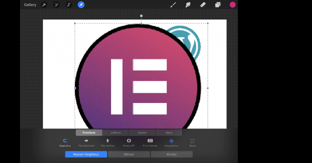 Tap on the mouse icon in the top menu, and then select the @ sign. - In the menu that has now appeared on the bottom of the screen, make sure that the uniform and the blue magnet options are selected. This assures the proportions remain the same regardless of any adjustments we make to the textbox.