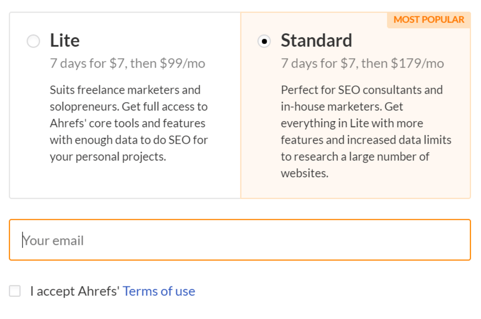 Ahrefs is not free. You can try it for the symbolic price of $7 for a 7-day access. Sure, this is not the standard approach to giving out trials, but, we believe that you should try it.
