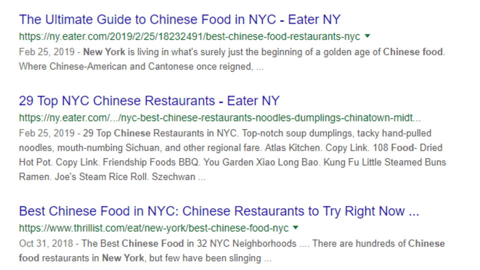 Let’s say that you were tasked with writing reviews about restaurants, specifically Chinese restaurants in New York. You want to create a review of several Chinese restaurants and you want your information to compete with the top search results. Let’s see what a quick Google search will yield when we write the following search query: “Chinese food new york”.