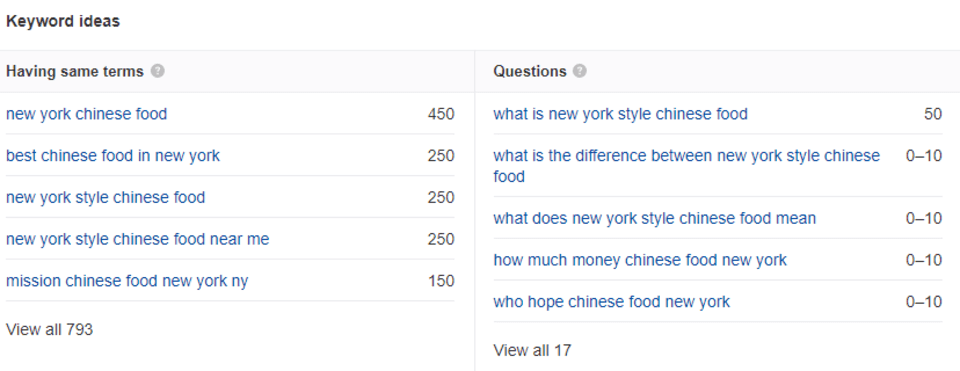 We can see that for the phrase: “New York Chinese food”, there are approximately 450 searches per month, which means that this is something that must be included in our article, in titles and content as users tend to search for this specific phrase.