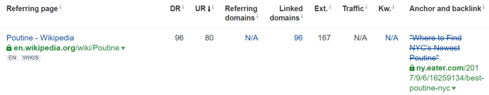 You can sort the results by different values, which in this case is the URL strength. A quick glance at the results lets us know that the top linking page (again, in terms of URL strength) is the https://en.wikipedia.org/wiki/Poutine page, which links to the https://ny.eater.com/2017/9/6/16259134/best-poutine-nyc article, about poutine. Clearly, someone at Wikipedia decided that the article at ny.eater about poutine was worth linking to.
