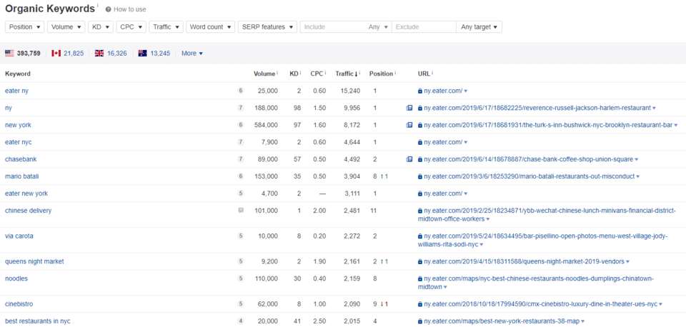 Now, let’s find a well-ranked competitor. From the google search query above, we see that when it comes to organic traffic, https://ny.eater.com is by far the more successful website. Let’s analyze it. Type the URL into the site explorer tool.