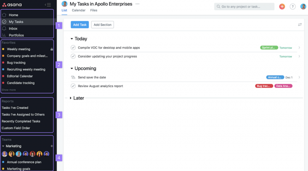 Pages in Asana all appear with a collapsible sidebar on the left, where you will find shortcuts to: