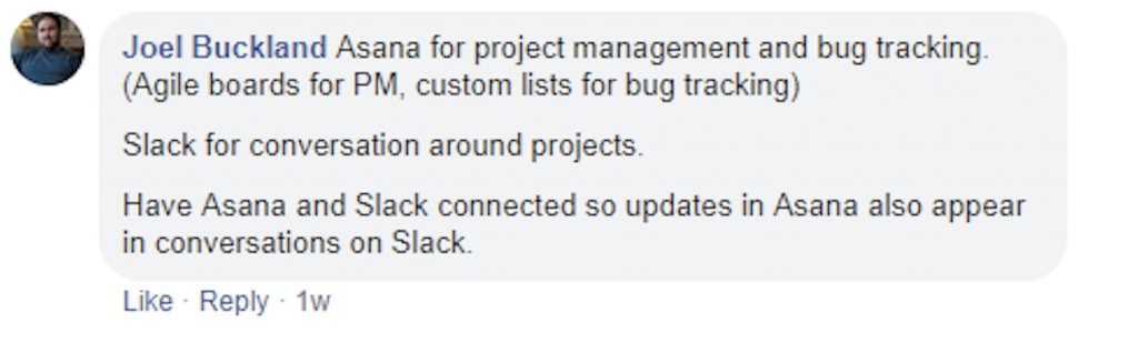 Some users, such as Joel Buckland and Prateek Choudhary use Asana for project management, bug tracking and enjoy the seamless integration with Slack, in much the same way as we do.