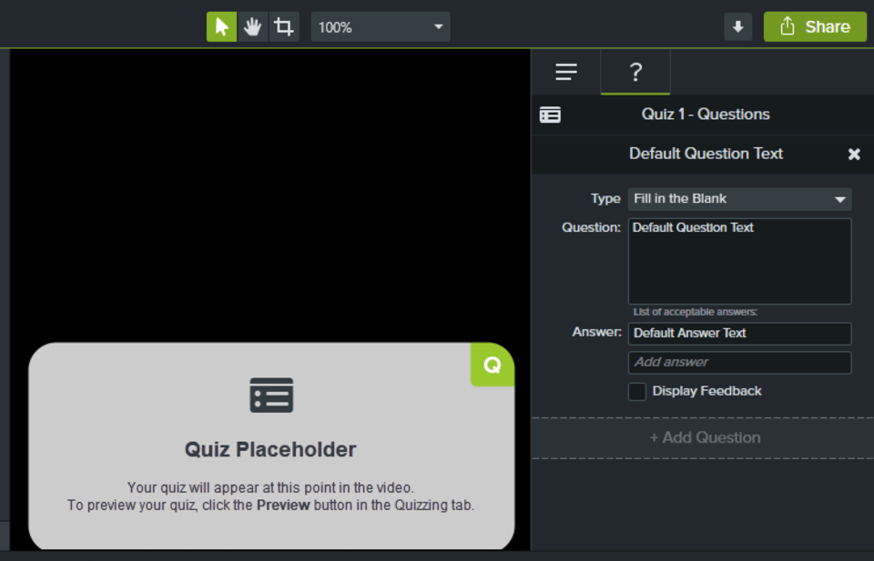 The process is really simple. In the toolbar on the left, choose Interactivity, and press on the timeline — the green button. Once done, you’ll be greeted by the quiz window on the right where you’ll be able to add the questions, answers and any feedback you’d like.