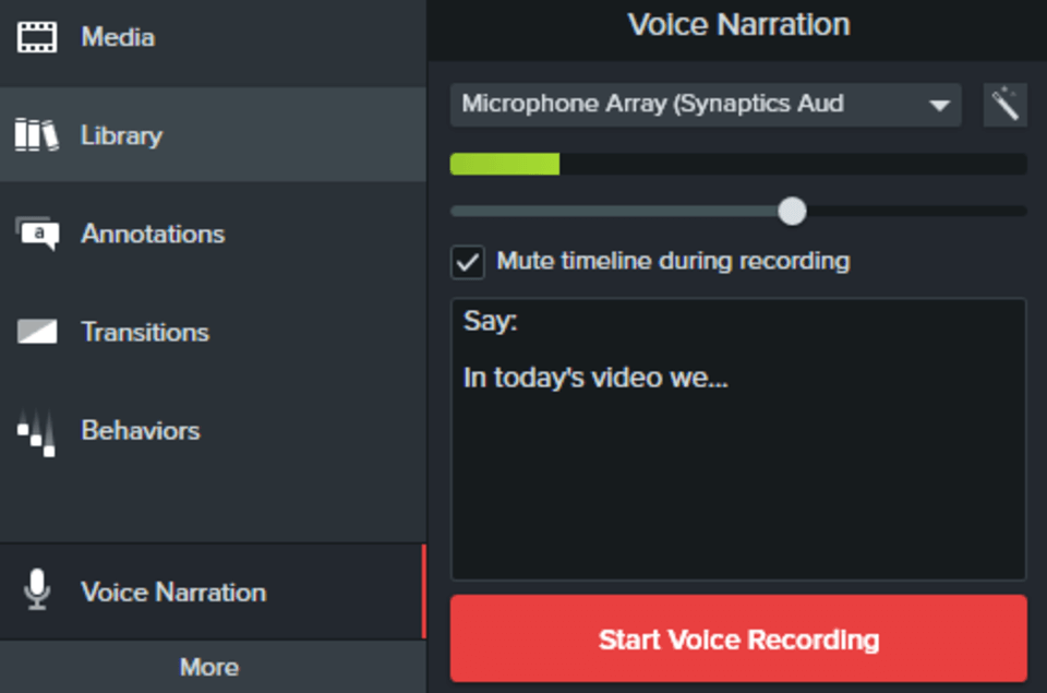 In addition to the standard audio features, Camtasia offers two additional features — speech recognition and voice narration.