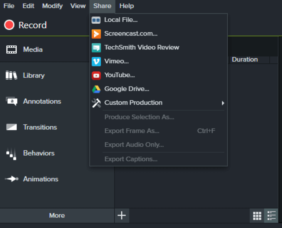 Another interesting feature that Camtasia has is the sharing feature. Once you’re done with video and you are ready to upload it, you can do it directly from Camtasia via the share button, which, upon selection, gives you to the ability to upload the video onto the most popular video social sites like YouTube, Vimeo and more.