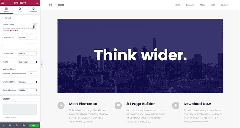 Let’s say that the content in your site is 900 pixel wide, instead of manually setting the content width of every new section to match the existing design, you can now customize Elementor’s default content area width for all your sections, in one global setting. Go to Elementor settings page, under ‘Style Settings’ > ‘Content Width’ you can set the default width of the content area. This feature is the easiest way to create a full width page in WordPress.