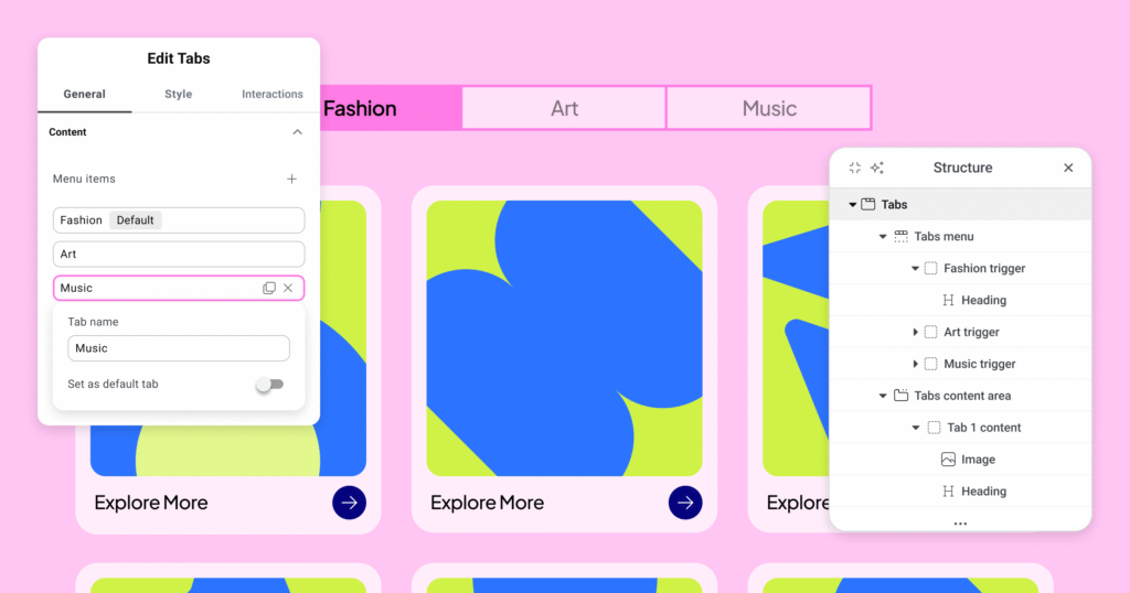 La fonctionnalité la plus demandée du nouvel éditeur atomique fait son arrivée. Les Nested Tabs permettent de construire des systèmes d’onglets entièrement personnalisables, composés d’éléments indépendants et compatibles avec les classes globales. Chaque partie (menu, triggers, contenus) peut être stylisée librement, offrant une souplesse inégalée.