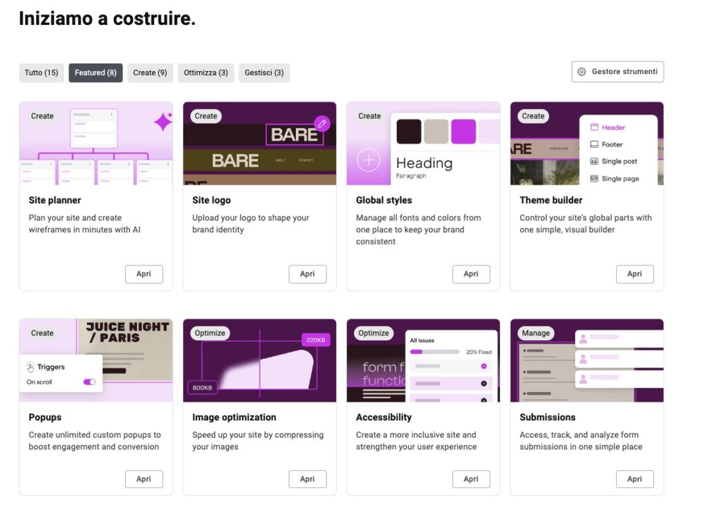 Tutti gli strumenti disponibili sono già presenti nella sezione Home del menu di Elementor nella bacheca di ogni sito WordPress che usa Elementor. Quando il sito è collegato a un abbonamento ONE tutti gli strumenti sono attivabili.