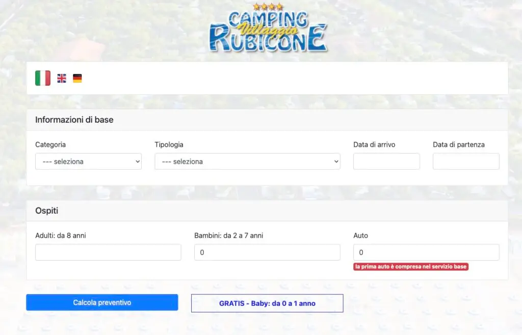 Per ovviare all’impossibilità di usare un sistema standard di prenotazione, si è optato per la costruzione di un Calcolatore di preventivi. Una volta inseriti i primi dati e calcolata la spesa, per verificare la disponibilità della soluzione scelta occorre inserire i dati e inviare la richiesta alla struttura che ricontatterà la potenziale clientela per la finalizzazione della prenotazione.