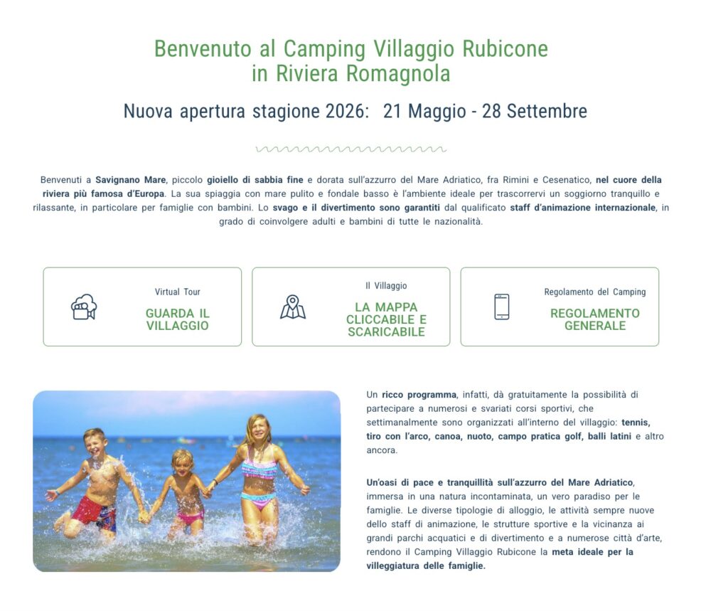 Nato nel 1957, il Camping Villaggio Rubicone è una presenza solida ed affermata della Riviera romagnola. Il nuovo sito rappresenta l’evoluzione dei servizi e dell’offerta vacanziera, in un’ottica moderna ma senza dimenticare il carattere accogliente e famigliare che contraddistingue l’accoglienza della struttura.