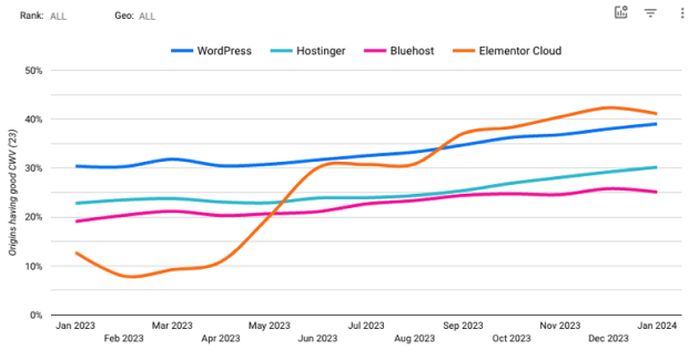 One of the best-known ways to measure performance is with the Core Web Vitals report, based on Google’s CRuX metrics, as collected from Chrome browser users.