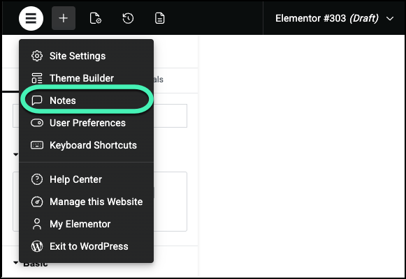 - Clicking the Elementor logo in the Editor top toolbar and selecting Notes.