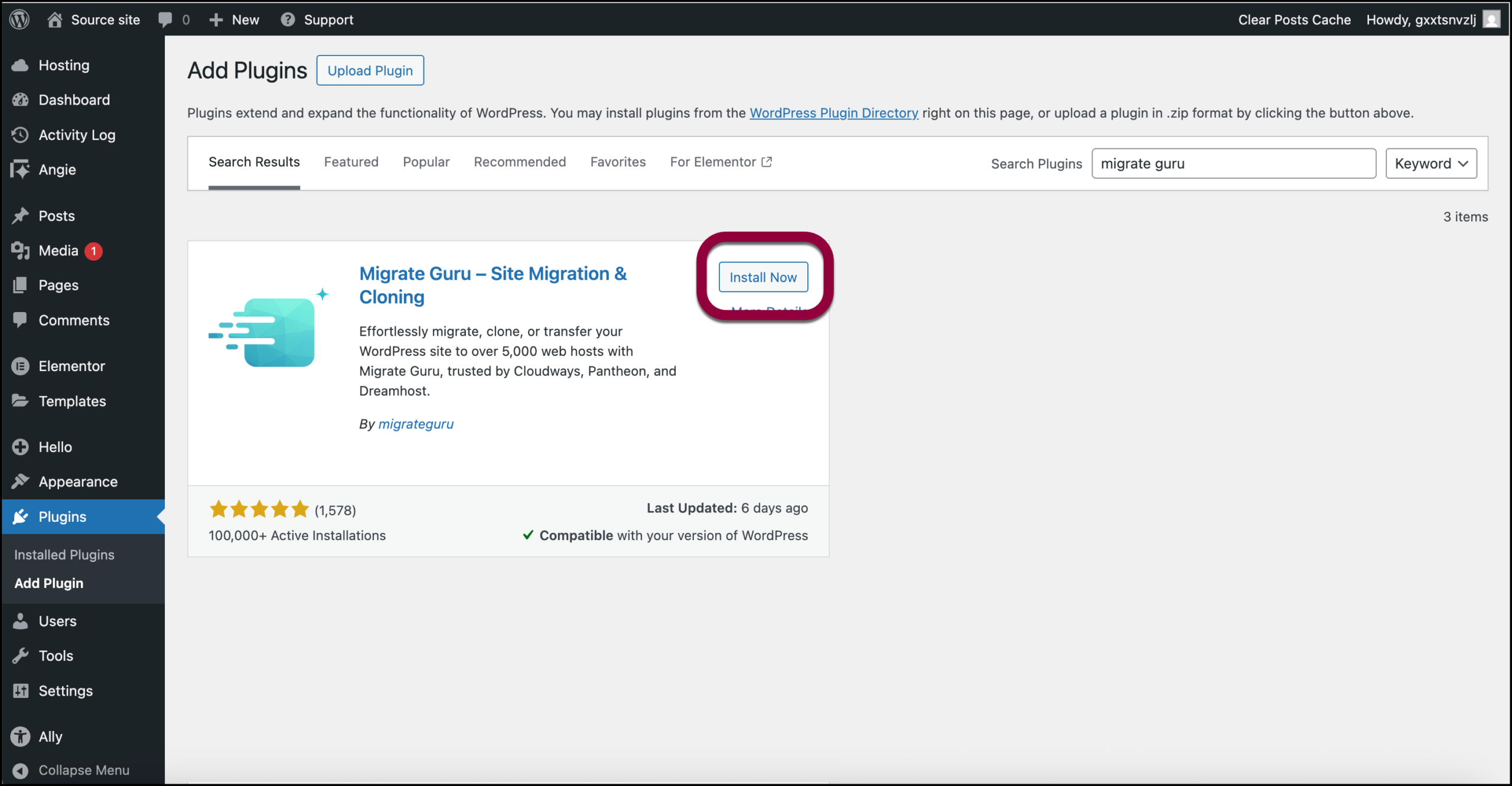 - After locating the Migrate Guru plugin, click Install Now.