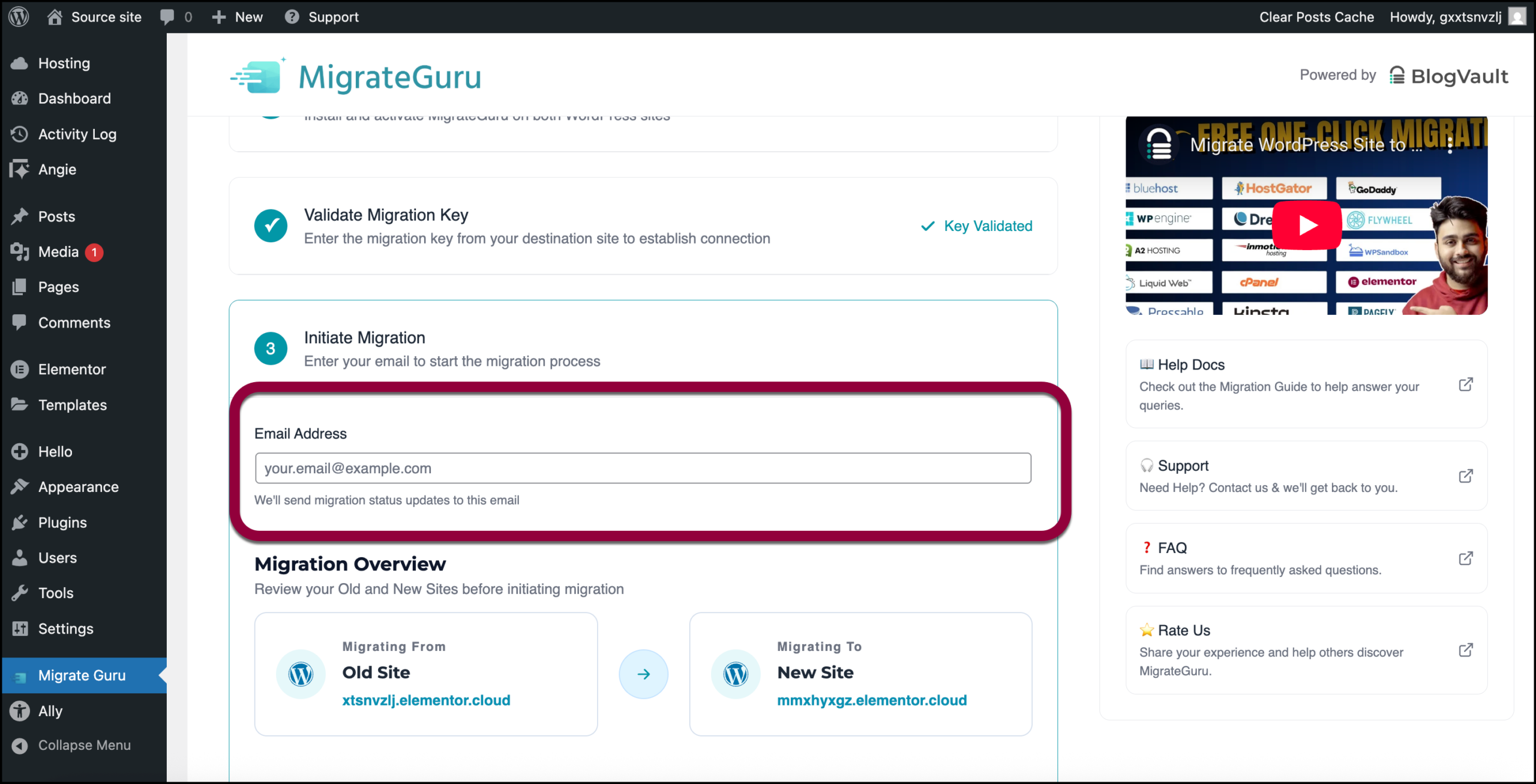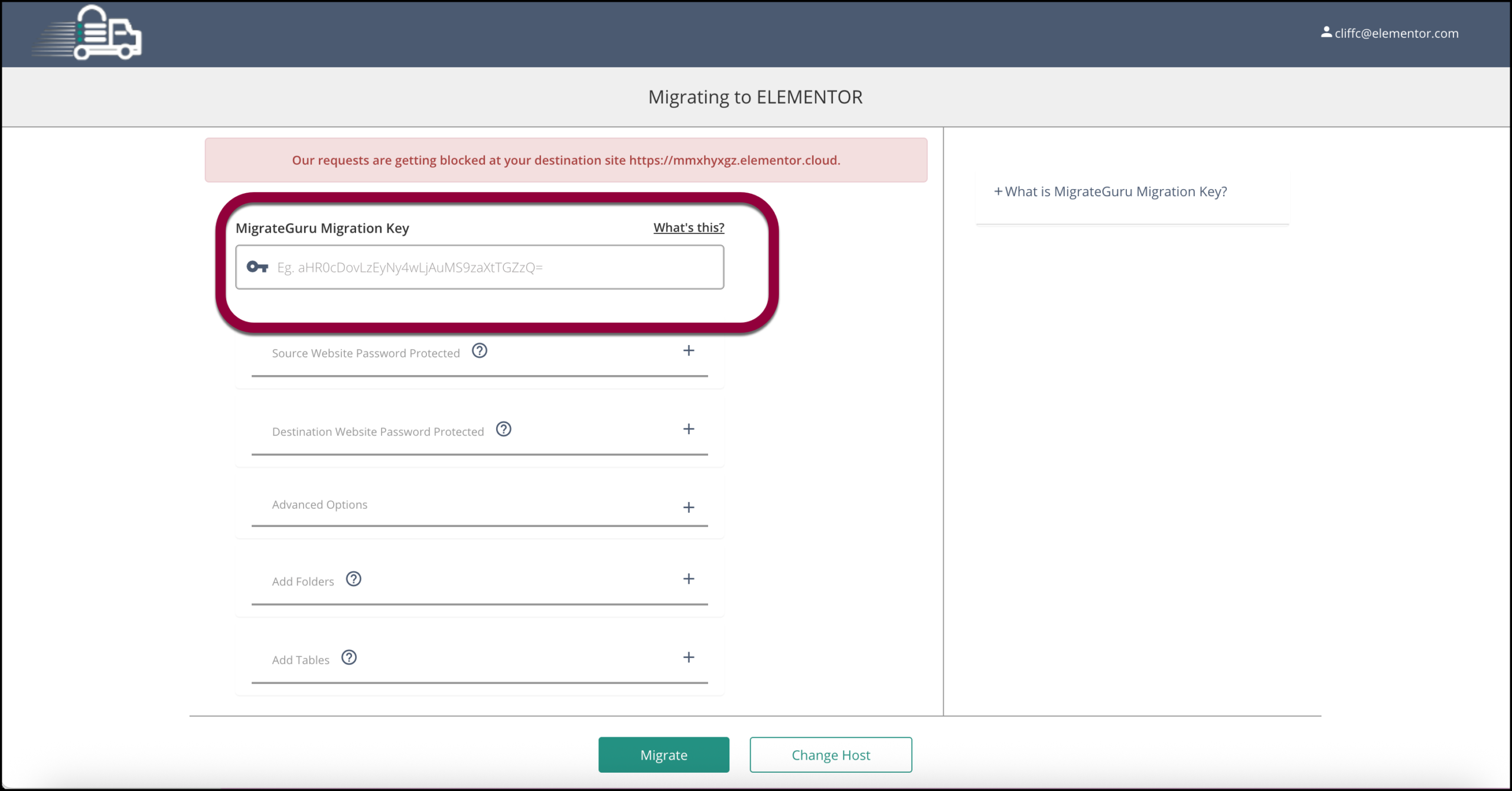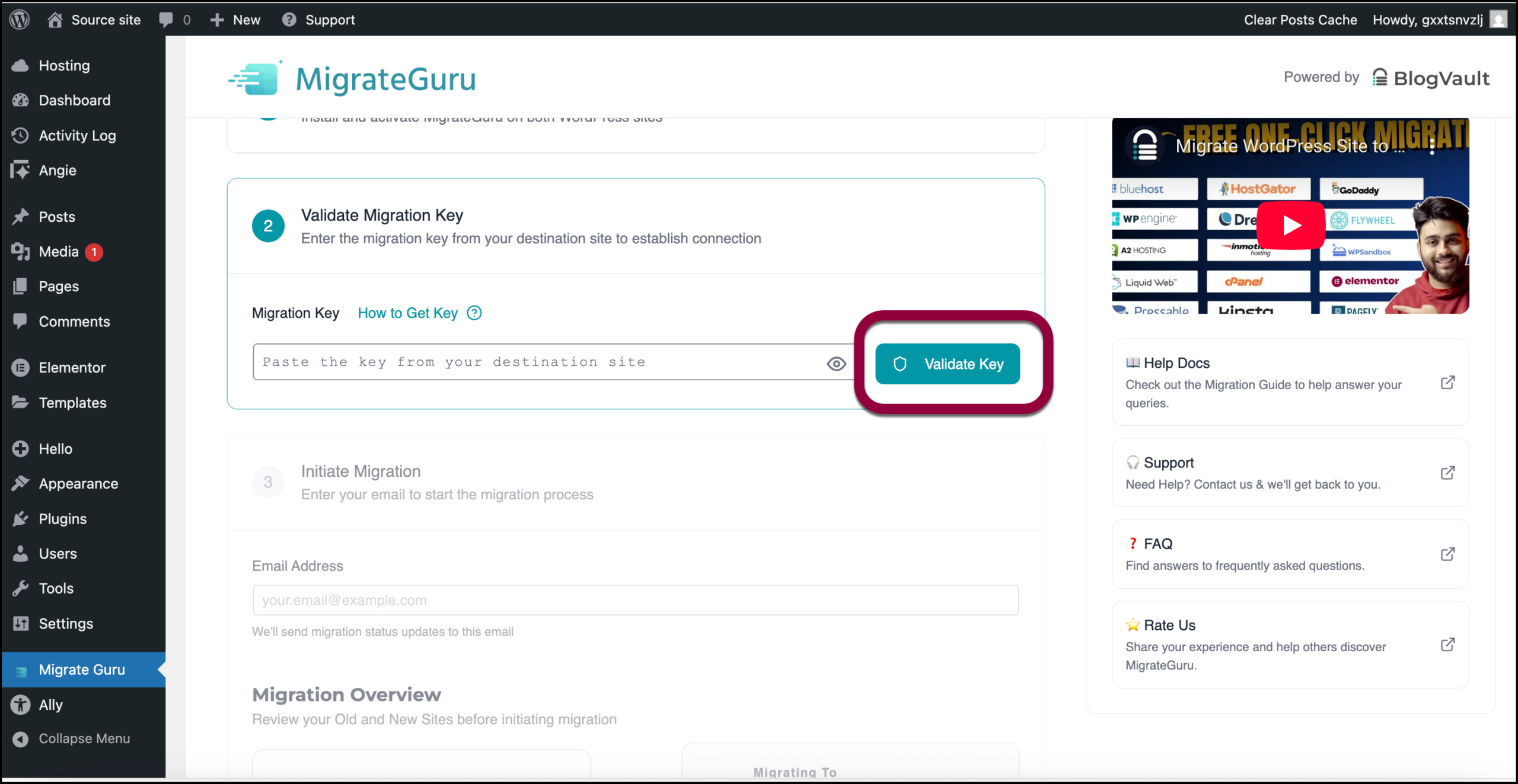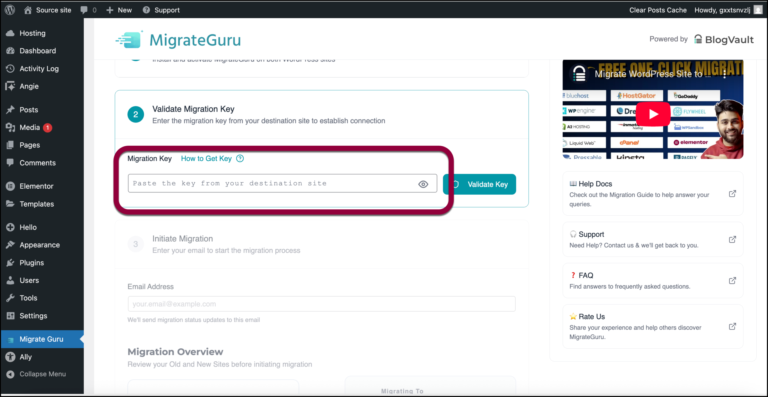 - In the MigrateGuru Migration Key field, paste the key you copied in step 6.