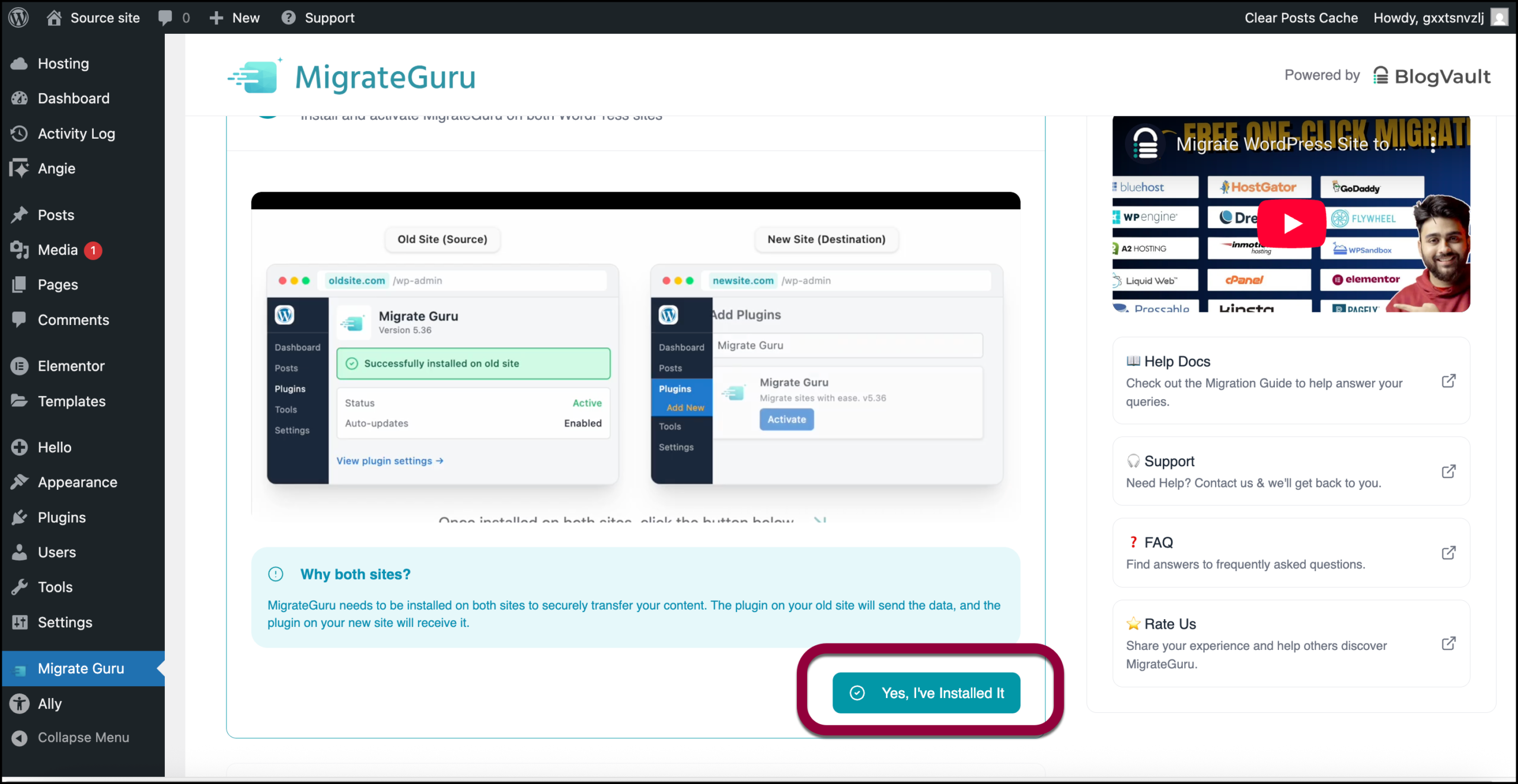 - Scroll down and click Yes I’ve installed it.NoteYou don’t actually need to install Migrate Guru on your destination site. Elementor takes care of this end of the process.