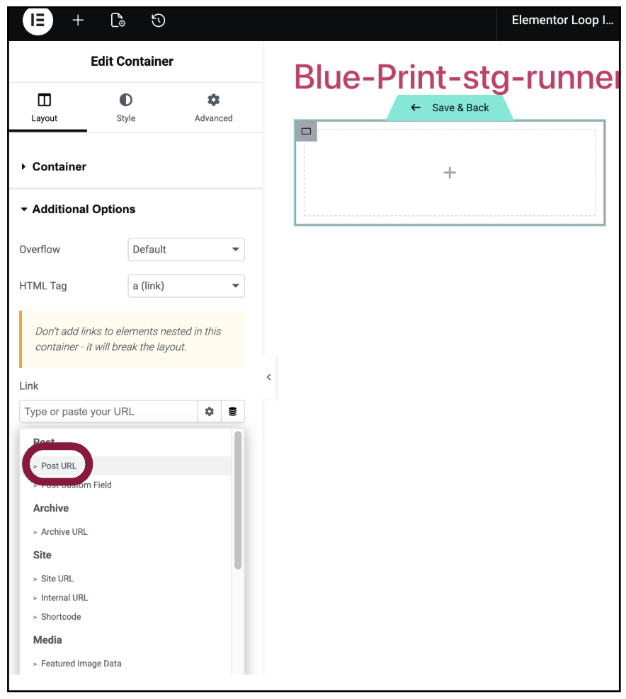 Adding this URL makes the container clickable – clicking the container will take visitors to the full blog post. Another option that let visitors access the full blog post would be to add a button. For example, a button that says Read More and links the post. However, you cannot make both the container and a button inside clickable. For details, see Nested Links.