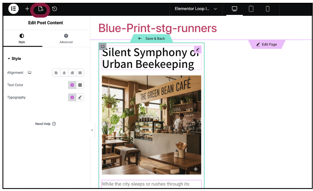 Since the widgets in the loop grid can vary in height, you may want to set the minimum height of the widgets to accommodate the height of the tallest items. This will give all the entries a more uniform look. - Click the page settings icon.