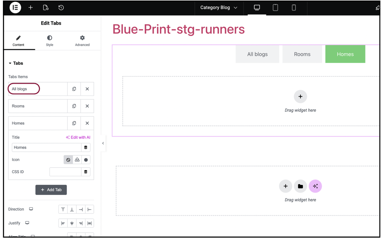 In the above example, we created a page to display all your blog items, but let’s say you want visitors to be able to access your blogs by category. In the example below we’ll create a blog page that contains tabs displaying different sets of posts.