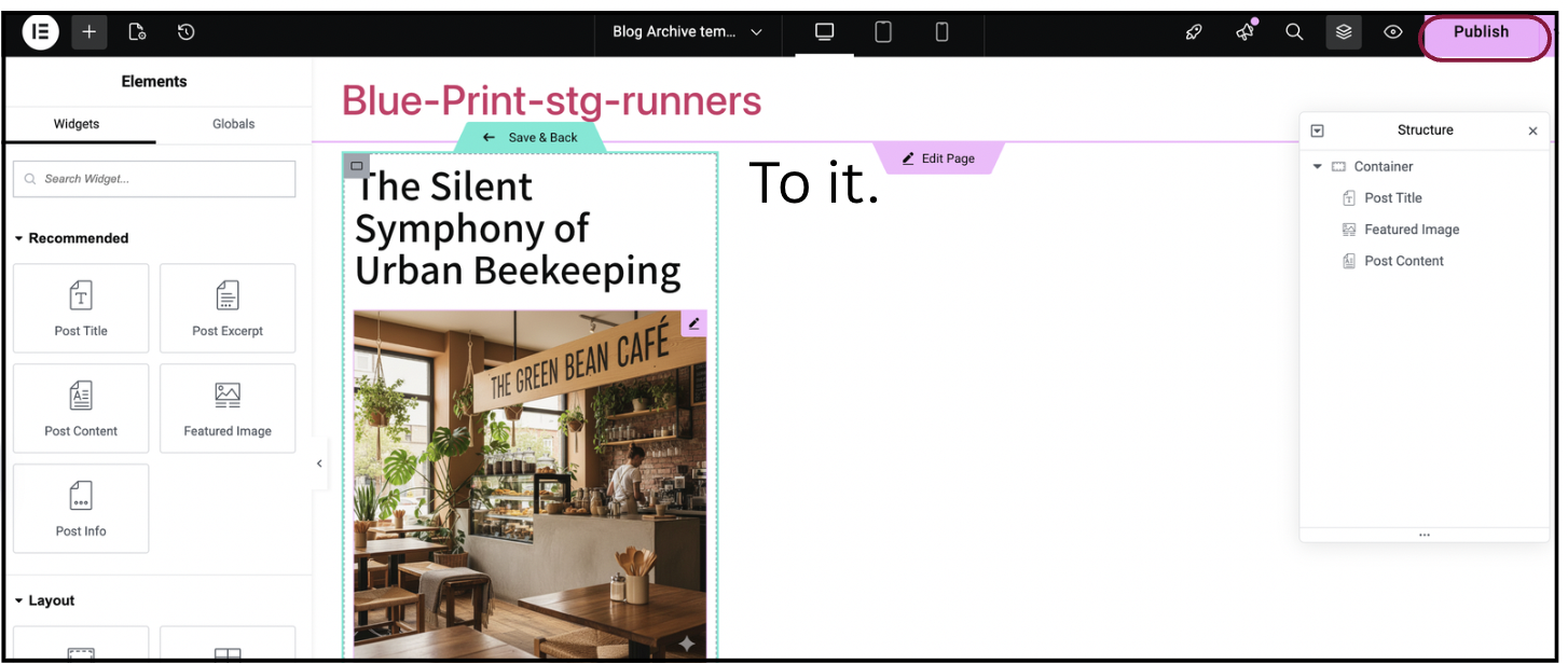 - Create a new page.NoteYou can design your blog page using all the design tools in the Elementor Editor but to keep things simple, the example below only details how to add an archive of blog posts to your page.