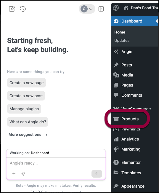 In order to add products, you must have WooCommerce installed. For help with installing WooCommerce, see Use Angie to install plugins.