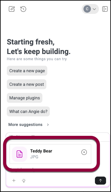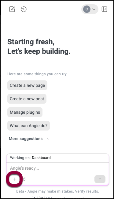 - In the Angie panel, click the “+” sign in the prompt box and add the spreadsheet file.