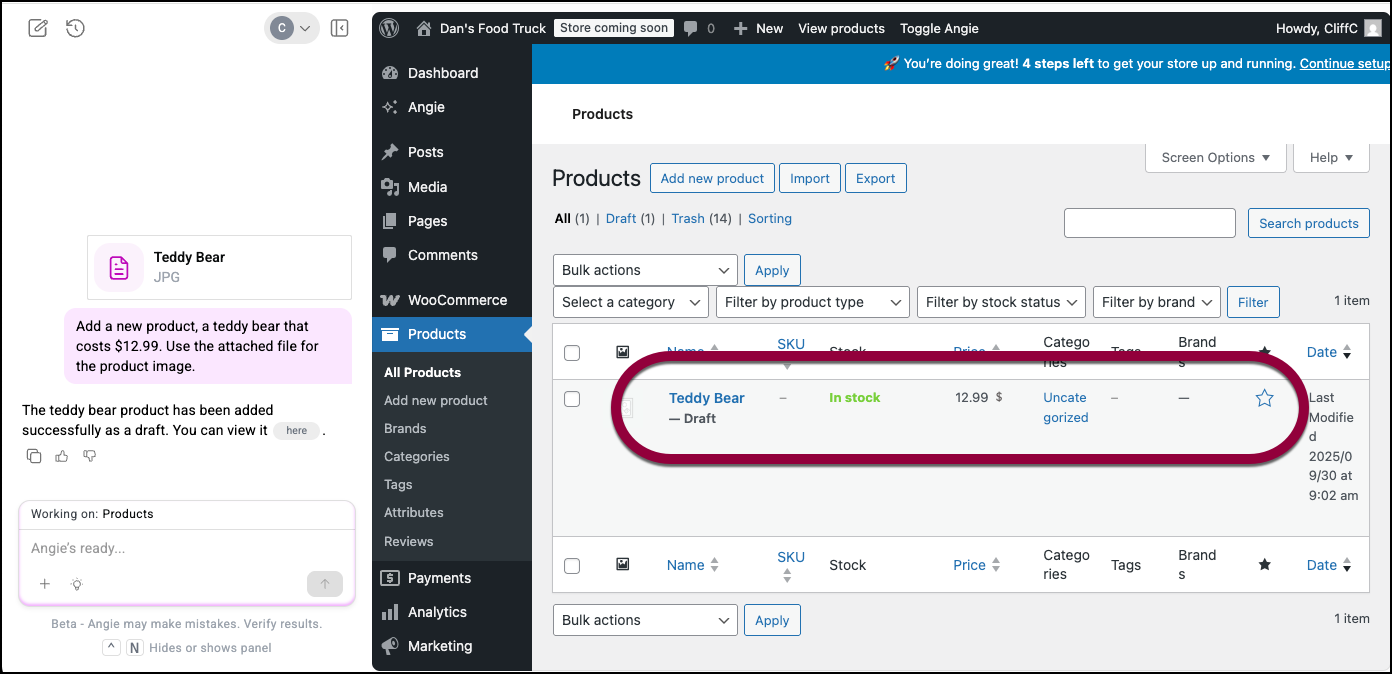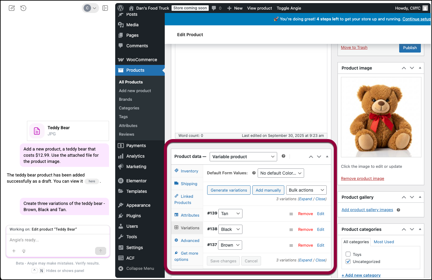- (Optional) Angie can also add product variations. You can try it out by adding this to the prompt: