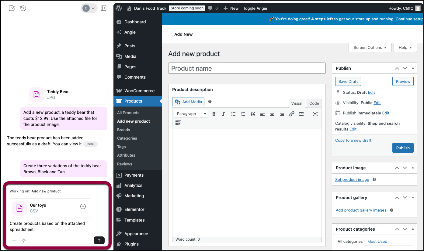 For online stores adding products can be repetitive and time consuming. Angie can help speed up this task.