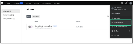 Once the menu opens, select Subscriptions. This will take you to a page displaying all the Elementor products and services you have purchased.